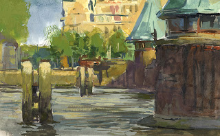 Plein air sketch of the koninginnebrug, Rotterdam. I don't think I have ever painted this fast to capture the quickly changing sunlight. I love this time of the day to paint, but time is very limited...