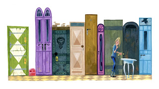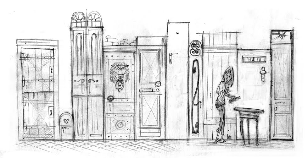 This sketch depicts the scene where Alice finds the key on the glass table, which opens the small door. This is very much the style and feel I am looking for...